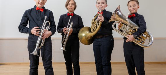 Es musizieren Schülerinnen und Schüler der Trompetenklassen Sophia Kälber und Snnhild Pfeiffer sowie der Posaunenklasse Eike Steege